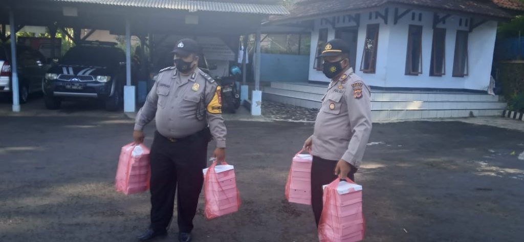 Ciamis Kicaunews.Com -Jajaran Personil Polsek Cisaga Polres Ciamis Polda Jabar dalam rangka Program Panci Berkah terhadap masyarakat yang sedang melaksanakan Isolasi Mandiri Polri peduli dengan melaksanakan kegiatan pembagian nasi kotak Senin 12/7/2021.