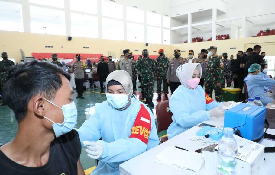Serang, Beritasatu.com – TNI dan Polri akan membantu tenaga kesehatan dalam rangka percepatan vaksinasi Covid-19 di Banten. Diharapkan target vaksinasi nasional dan herd immunity (kekebalan komunal) dapat segera dicapai. Hal itu disampaikan Panglima TNI Marsekal TNI Hadi Tjahjanto saat meninjau sentra vaksinasi di Universitas Tirtayasa (Untirta), Serang, Banten, Minggu (18/7/2021).