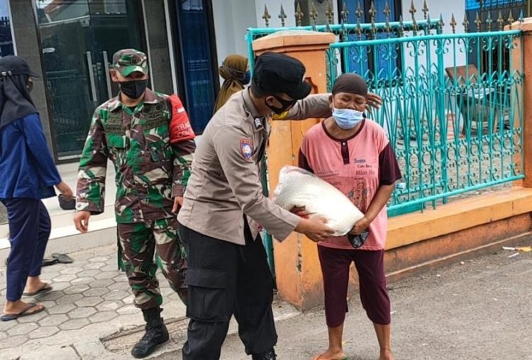 Sinergitas TNI-POLRI memberikan bantuan sosial berupa beras kepada warga yang kurang mampu di tengah pandemi Covid-19, dengan Surprise/Kejutan.